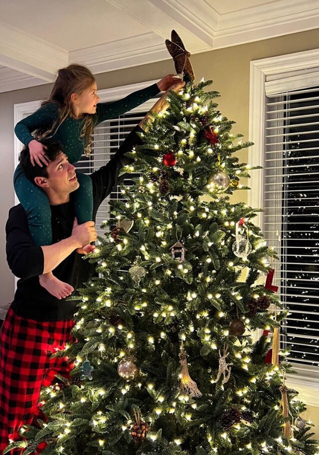 → La famille Price a fini de décorer son sapin de Noël. C’est Liv, montée sur les épaules de papa Price, qui a mis la touche finale au sommet de l’arbre.
